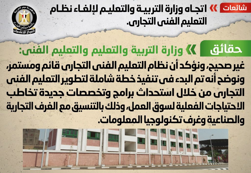 تردد في بعض وسائل الإعلام والمواقع الإلكترونية وصفحات التواصل الاجتماعي أنباء بشأن اتجاه وزارة التربية والتعليم لإلغاء نظام التعليم الفني التجاري، وقد قام المركز الإعلامي لمجلس الوزراء بالتواصل مع وزارة التربية والتعليم والتعليم الفني، والتي نفت تلك الأنباء، مُؤكدةً أنه لا صحة لإلغاء نظام التعليم الفني التجاري، وأن نظام التعليم الفني التجاري قائم ومستمر، مُوضحةً أنه تم البدء في تنفيذ خطة شاملة لتطوير التعليم الفني التجاري من خلال استحداث برامج وتخصصات جديدة تخاطب الاحتياجات الفعلية لسوق العمل، وذلك بالتنسيق مع الغرف التجارية والصناعية وغرف تكنولوجيا المعلومات.