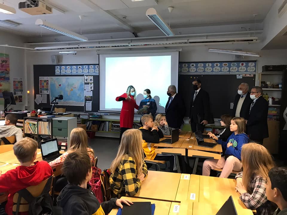 واستمع الوزير إلى العرض الذي قدمته مديرة المدرسة حول مساهمتها في تعزيز جودة المعلمين في فنلندا منذ عام ١٨٨٦، وذلك من خلال توفير بيئة آمنة وعالية الجودة للتعليم والتعاون بين المعلمين، وبما يساهم في تطوير عملية التعليم وتطوير المناهج وأساليب التدريب والتعليم.