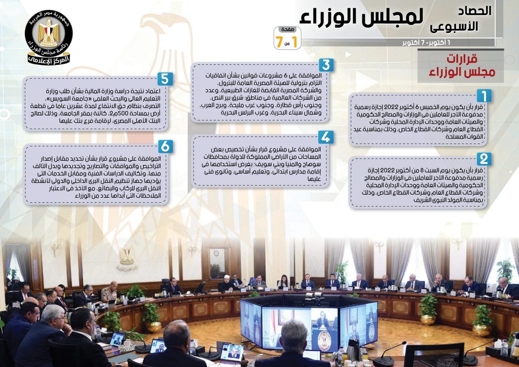 وجاء في التقرير أنه تم إصدار عدد من القرارات، تشمل قرارا بأن يكون يوم الخميس 6 أكتوبر 2022 إجازة رسمية مدفوعة الأجر للعاملين في الوزارات والمصالح الحكومية والهيئات العامة ووحدات الإدارة المحلية وشركات القطاع العام وشركات القطاع الخاص، وذلك بمناسبة عيد القوات المسلحة، وكذلك قرار بأن يكون يوم السبت 8 من أكتوبر 2022 إجازة رسمية مدفوعة الأجر للعاملين في الوزارات والمصالح الحكومية والهيئات العامة ووحدات الإدارة المحلية وشركات القطاع العام وشركات القطاع الخاص، وذلك بمناسبة المولد النبوي الشريف، بالإضافة إلى الموافقة على 6 مشروعات قوانين بشأن اتفاقيات التزام بترولية للهيئة المصرية العامة للبترول، والشركة المصرية القابضة للغازات الطبيعية، وعدد من الشركات العالمية في مناطق: شرق بير النص، وجنوب رأس قطارة، وجنوب غرب مليحة، وبرج العرب، وشمال سيناء البحرية، وغرب البرلس البحرية، فضلاً عن الموافقة على مشروع قرار بشأن تخصيص بعض المساحات من الأراضي المملوكة للدولة بمحافظات سوهاج والمنيا وبني سويف؛ بغرض استخدامها في إقامة مدارس ابتدائي، وتعليم أساسي، وثانوي فني عليها، كما تم اعتماد نتيجة دراسة وزارة المالية بشأن طلب وزارة التعليم العالي والبحث العلمي “جامعة السويس”، التصرف بنظام حق الانتفاع لمدة عشرين عاماً في قطعة أرض بمساحة 500م2، كائنة بمقر الجامعة، وذلك لصالح البنك الأهلي المصري، لإقامة فرع بنك عليها، إلى جانب الموافقة على مشروع قرار بشأن تحديد مقابل إصدار التراخيص والموافقات والتصاريح وتجديدها وبدل التالف منها، وتكاليف الدراسات الفنية ومقابل الخدمات التي يؤديها جهاز تنظيم النقل البري الداخلي والدولي لأنشطة النقل البري للركاب والبضائع، مع الأخذ في الاعتبار الملاحظات التي أبداها عدد من الوزراء.