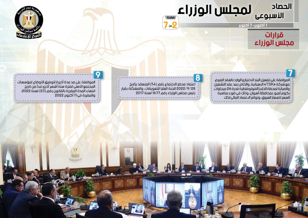 كما تضمنت القرارات أيضاً وفقاً لما أبرزه التقرير، الموافقة على تفعيل البند الاختياري الوارد بالعقد المبرم مع شركة “TSK” الاسبانية، والخاص بمد عقد التشغيل والصيانة لمحطة الخلايا الفوتوفلطية قدرة 26 ميجاوات، بكوم أمبو، بمحافظة أسوان، وذلك في ضوء مناسبة السعر لأسعار السوق، وتوافر الاعتماد المالي لذلك، في حين تم اعتماد محضر الاجتماع رقم (54) المنعقد بتاريخ 28/9/2022 للجنة العليا للتعويضات، والمشكلة بقرار رئيس مجلس الوزراء رقم 1677 لسنة 2017، بالإضافة إلى الموافقة على مد مدة أخيرة لتوفيق الأوضاع لمؤسسات المجتمع الأهلى لفترة ستة أشهر أخرى تبدأ من تاريخ انتهاء المدة المقررة بالقانون رقم (23) لسنة 2022، والمقررة فى 11 أكتوبر 2022.