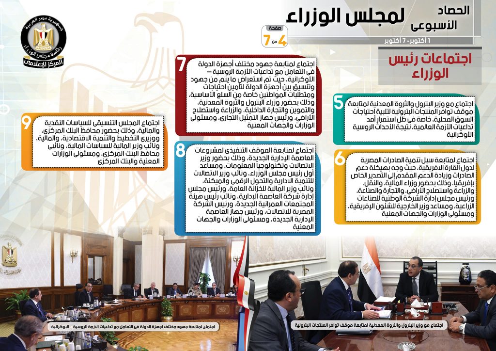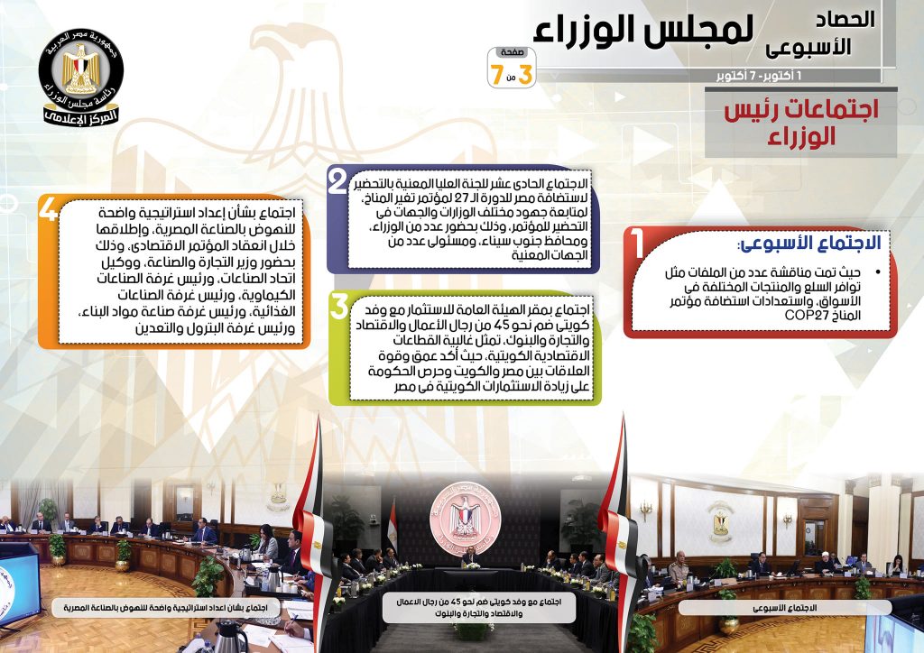 وعلى صعيد الاجتماعات التي عقدها مصطفى مدبولي رئيس مجلس الوزراء، أوضح التقرير أنه تم عقد الاجتماع الحادي عشر للجنة العليا المعنية بالتحضير لاستضافة مصر للدورة الـ 27 لمؤتمر تغير المناخ، لمتابعة جهود مختلف الوزارات والجهات في التحضير للمؤتمر، وذلك بحضور عدد من الوزراء، ومحافظ جنوب سيناء، ومسئولي عدد من الجهات المعنية، فضلاً عن اجتماع بمقر الهيئة العامة للاستثمار مع وفد كويتي ضم نحو ٤٥ من رجال الأعمال والاقتصاد والتجارة والبنوك، تمثل غالبية القطاعات الاقتصادية الكويتية، حيث أكد عمق وقوة العلاقات بين مصر والكويت وحرص الحكومة على زيادة الاستثمارات الكويتية في مصر، بالإضافة إلى اجتماع بشأن إعداد استراتيجية واضحة للنهوض بالصناعة المصرية، وإطلاقها خلال انعقاد المؤتمر الاقتصادي، وذلك بحضور وزير التجارة والصناعة، ووكيل اتحاد الصناعات، ورئيس غرفة الصناعات الكيماوية، ورئيس غرفة الصناعات الغذائية، ورئيس غرفة صناعة مواد البناء، ورئيس غرفة البترول والتعدين، وكذلك اجتماع مع وزير البترول والثروة المعدنية لمتابعة موقف توافر المنتجات البترولية لتلبية احتياجات السوق المحلية، خاصة في ظل استمرار أمد تداعيات الأزمة العالمية، نتيجة الأحداث الروسية الأوكرانية، بجانب اجتماع لمتابعة سبل تنمية الصادرات المصرية لدول القارة الافريقية، حيث وجه بهيكلة دعم الصادرات وزيادة الدعم المقدم إلى التصدير الخاص بإفريقيا، وذلك بحضور وزراء المالية، والنقل، والزراعة واستصلاح الأراضي، والتجارة والصناعة، ورئيس مجلس إدارة الشركة الوطنية للصناعات الزراعية، ومساعد وزير الخارجية للشئون الإفريقية، ومسئولي الوزارات والجهات المعنية.