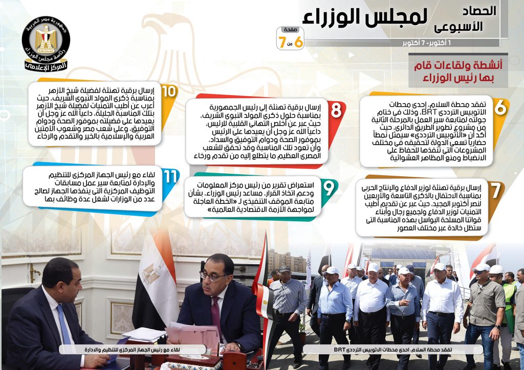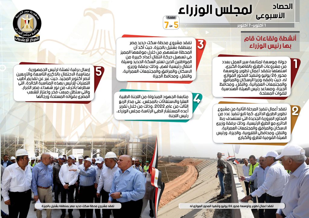 وبشأن الأنشطة التي قام بها رئيس مجلس الوزراء، فبحسب التقرير، شملت قيام سيادته بجولة موسعة لمتابعة سير العمل بعدد من مشروعات الطرق بالقاهرة الكبرى، استهلها بتفقد أعمال تطوير وتوسعة محور 26 يوليو وتنفيذ المحور الموازي له، حيث رافقه وزيرا الإسكان والمرافق والمجتمعات العمرانية، والنقل، ومحافظ الجيزة، ومساعد رئيس الهيئة الهندسية للقوات المسلحة، في حين تفقد سيادته أعمال تنفيذ المرحلة الثانية من مشروع تطوير الطريق الدائري، كما تابع تنفيذ عدد من المحاور المرورية الجديدة التي تستهدف ربط الدائري مع الطرق الرئيسية، وذلك برفقة وزيري الاسكان والمرافق والمجتمعات العمرانية، والنقل، ومحافظي القليوبية، والجيزة، ورئيس الهيئة القومية للطرق والكباري، بالإضافة إلى تفقد مشروع محطة سكك حديد مصر بمنطقة بشتيل بالجيزة، حيث أكد أن المحطة ستسهم من خلال موقعها المميز في تسهيل حركة انتقال أعداد كبيرة من المواطنين الذين تعتبر السكة الحديد وسيلة انتقال رئيسية لهم، وذلك برفقة وزيري الاسكان والمرافق والمجتمعات العمرانية، والنقل، ومحافظ الجيزة، كما قام سيادته بتفقد محطة السلام، إحدى محطات الأتوبيس الترددي BRT، وذلك في ختام جولته لمتابعة سير العمل بالمرحلة الثانية من مشروع تطوير الطريق الدائري، حيث أكد أن “الأتوبيس الترددي” سيمثل نمطاً حضارياً تسعى الدولة لتحقيقه في مختلف المشروعات التي تنفذها للحفاظ على الانضباط ومنع المظاهر العشوائية.