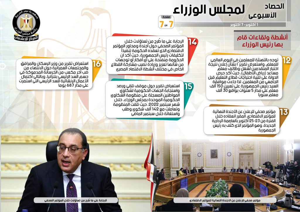 نشر المركز الإعلامي لمجلس الوزراء، اليوم الجمعة، تقريرا شمل إنفوجرافات سلط من خلالها الضوء على الحصاد الأسبوعي لمجلس الوزراء، وذلك خلال الفترة من1حتى7أكتوبر 2022، والذي تضمن الموافقة على عدد من القرارات، فضلاً عن الاجتماعات واللقاءات التي عقدها مصطفى مدبولي، رئيس مجلس الوزراء، بالإضافة إلى ما قام به من أنشطة.