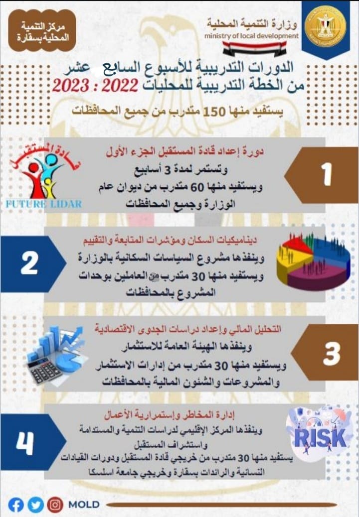 وقال وزير التنمية المحليةإن الأسبوع التدريبي الـ 17 سيتضمن أيضاً 3 دورات تدريبية وهي دورة ديناميكيات السكان ومؤشرات المتابعة والتقييم وينفذها مشروع السياسات السكانيه بالوزارة، ودورة التحليل المالي وإعداد دراسات الجدوى الاقتصادية التي يقوم بتنفيذها الهيئة العامة للاستثمار، ودورة إدارة المخاطر وإستمرارية الأعمال التي ينفذها المركز الإقليمي لدراسات التنميه المستدامة واستشراف المستقبل ، ويستفيد من تلك الدورات 90 متدرباً من جميع المحافظات .
