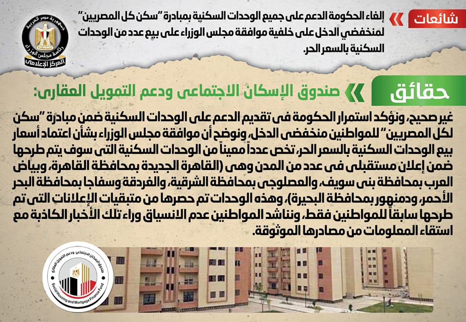 المركز الإعلامي لمجلس الوزراء ينفي ما انتشر في بعض المواقع الإلكترونية وصفحات التواصل الاجتماعي من أنباء بشأن إلغاء الحكومة الدعم على جميع الوحدات السكنية بمبادرة “سكن كل المصريين” لمنخفضي الدخل على خلفية موافقة مجلس الوزراء على بيع عدد من الوحدات السكنية بالسعر الحر، وقد قام المركز الإعلامي لمجلس الوزراء بالتواصل مع صندوق الإسكان الاجتماعي ودعم التمويل العقاري، والذي نفي تلك الأنباء، مُؤكداً أنه لا صحة لإلغاء الحكومة الدعم على جميع الوحدات السكنية بمبادرة “سكن كل المصريين” لمنخفضي الدخل على خلفية موافقة مجلس الوزراء على بيع عدد من الوحدات السكنية بالسعر الحر، مُوكداً استمرار الحكومة في تقديم الدعم على الوحدات السكنية ضمن مبادرة “سكن لكل المصريين” للمواطنين منخفضي الدخل، مُوضحاً أن موافقة مجلس الوزراء بشأن اعتماد أسعار بيع الوحدات السكنية بالسعر الحر، تخص عدداً معيناً من الوحدات السكنية التي سوف يتم طرحها ضمن إعلان مستقبلي في عدد من المدن وهي (القاهرة الجديدة بمحافظة القاهرة، وبياض العرب بمحافظة بنى سويف، والعصلوجي بمحافظة الشرقية، والغردقة وسفاجا بمحافظة البحر الأحمر، ودمنهور بمحافظة البحيرة)، وهذه الوحدات تم حصرها من متبقيات الإعلانات التي تم طرحها سابقاً للمواطنين فقط، مُناشداً المواطنين عدم الانسياق وراء تلك الأخبار الكاذبة مع استقاء المعلومات من مصادرها الموثوقة.
