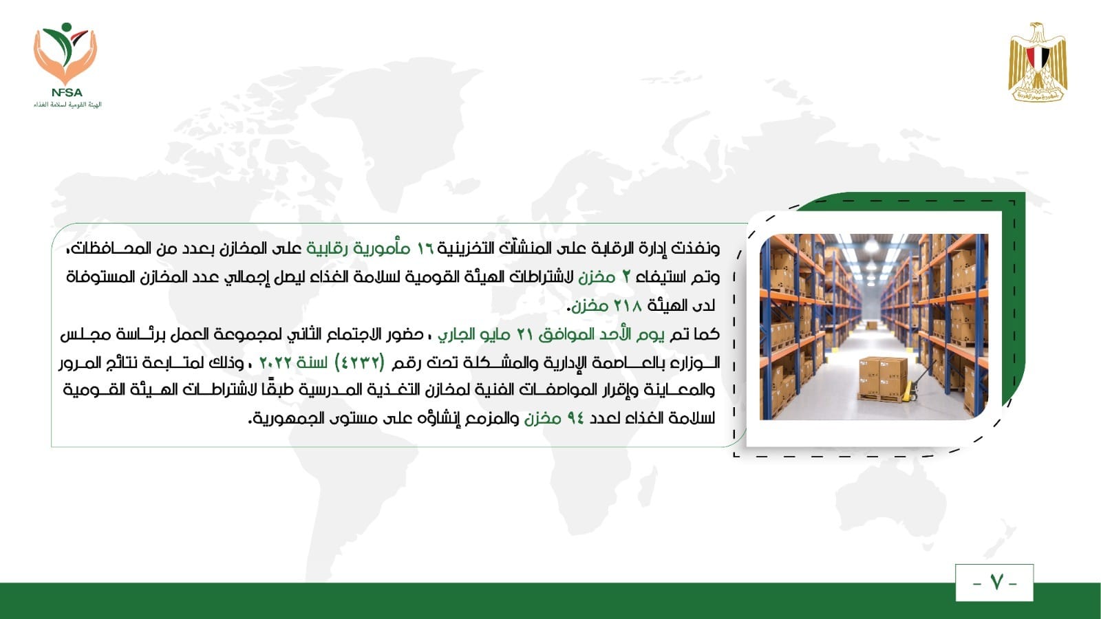 كما تم يوم الأحد الموافق 21 مايو الجاري ، حضور الاجتماع الثاني لمجموعة العمل برئاسة مجلس الوزارء بالعاصمة الإدارية والمشكلة تحت رقم (4232) لسنة 2022 ، وذلك لمتابعة نتائج المرور والمعاينة وإقرار المواصفات الفنية لمخازن التغذية المدرسية طبقًا لاشتراطات الهيئة القومية لسلامة الغذاء لعدد 94 مخزن والمزمع إنشاؤه على مستوى الجمهورية .