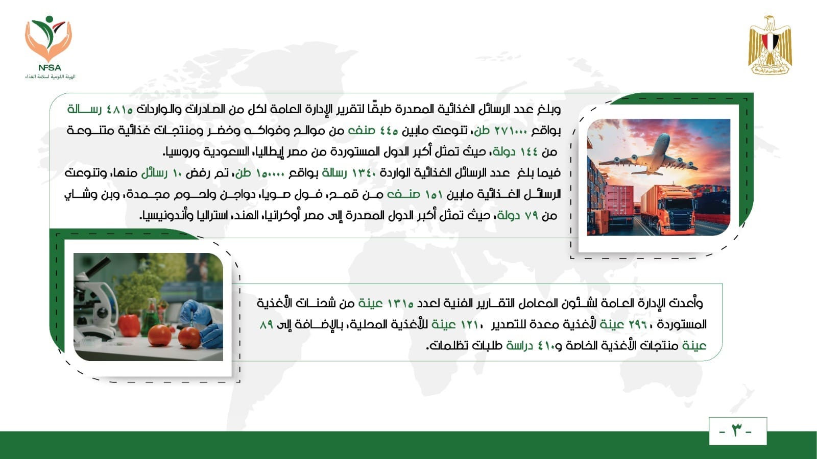 وبلغ عدد الرسائل الغذائية المصدرة طبقًا لتقرير الإدارة العامة لكل من الصادرات والواردات 4815 رسالة بواقع 271000 طن، تنوعت مابين 445 صنف من موالح وفواكه وخضر ومنتجات غذائية متنوعة من 144 دولة، حيث تمثل أكبر الدول المستوردة من مصر إيطاليا، السعودية وروسيا.