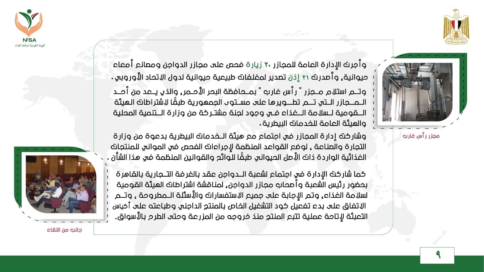 وشاركت إدارة المجازر في اجتماع مع هيئة الخدمات البيطرية بدعوة من وزارة التجارة والصناعة ، لوضع القواعد المنظمة لإجراءات الفحص في المواني للمنتجات الغذائية الواردة ذات الأصل الحيواني طبقًا للوائح والقوانين المنظمة في هذا الشأن.