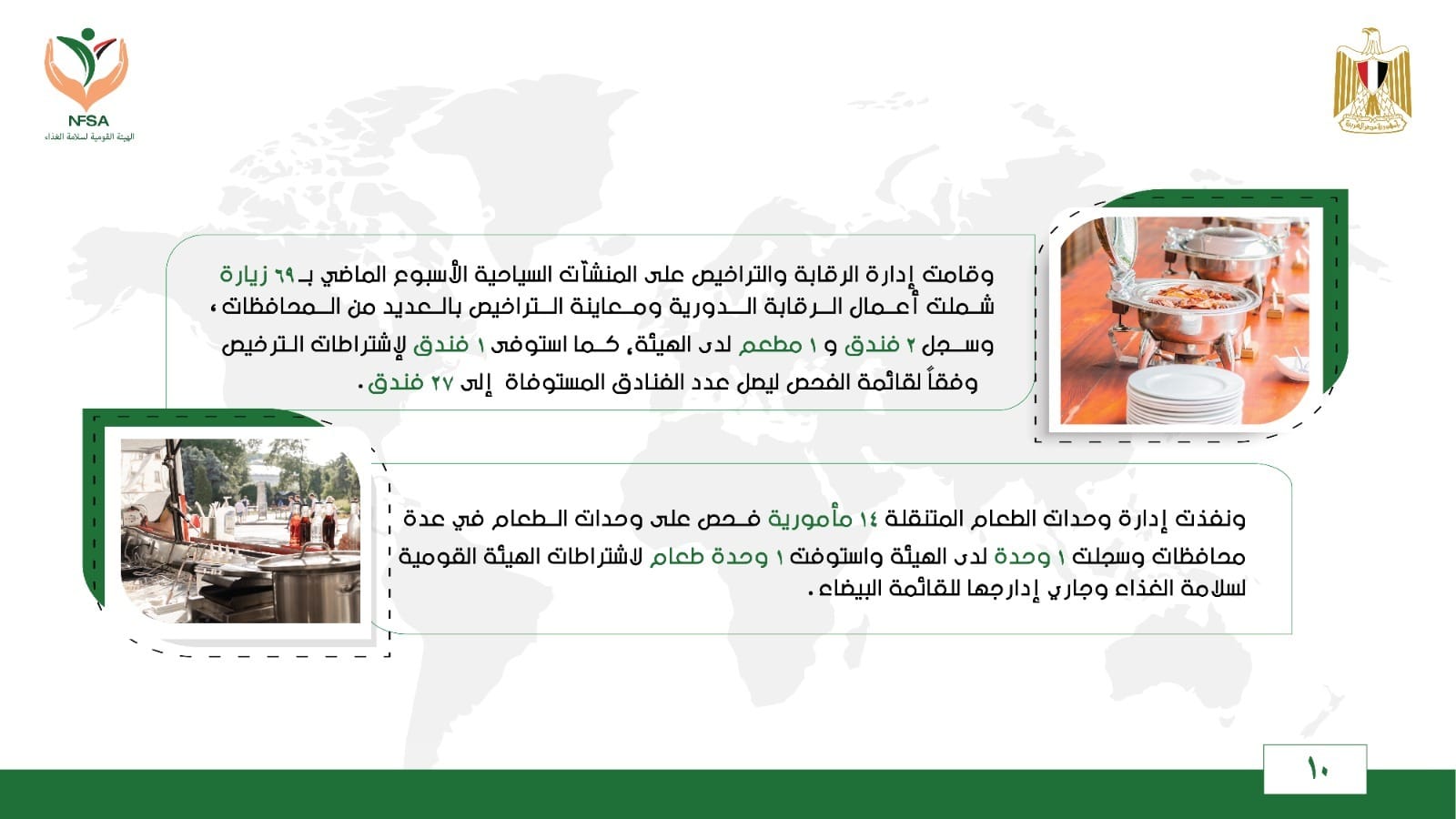 ونفذت إدارة وحدات الطعام المتنقلة 14 مأمورية فحص على وحدات الطعام في عدة محافظات وسجلت 1 وحدة لدى الهيئة، واستوفت 1 وحدة طعام لاشتراطات الهيئة القومية لسلامة الغذاء وجاري إدارجها للقائمة البيضاء.