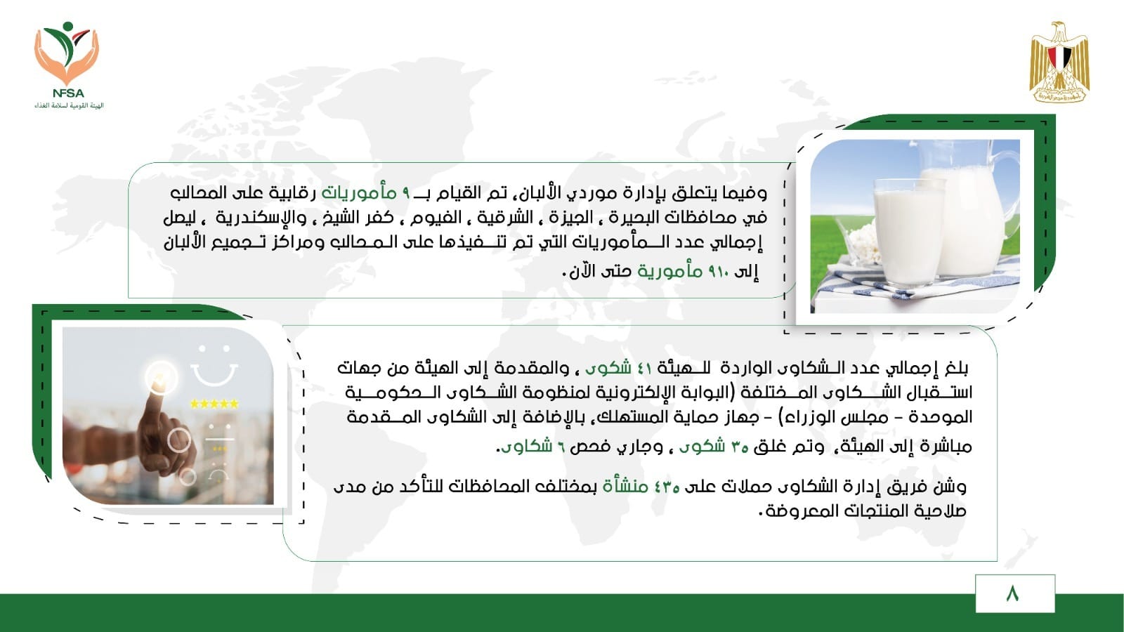 وفيما يتعلق بإدارة موردي الألبان، تم القيام بــــ 9 مأموريات رقابية على المحالب في محافظات البحيرة ، الجيزة ، الشرقية ، الفيوم ، كفر الشيخ ، و الإسكندرية ، ليصل إجمالي عدد المأموريات التي تم تنفيذها على المحالب ومراكز تجميع الألبان إلى 910 مأمورية حتى الآن.