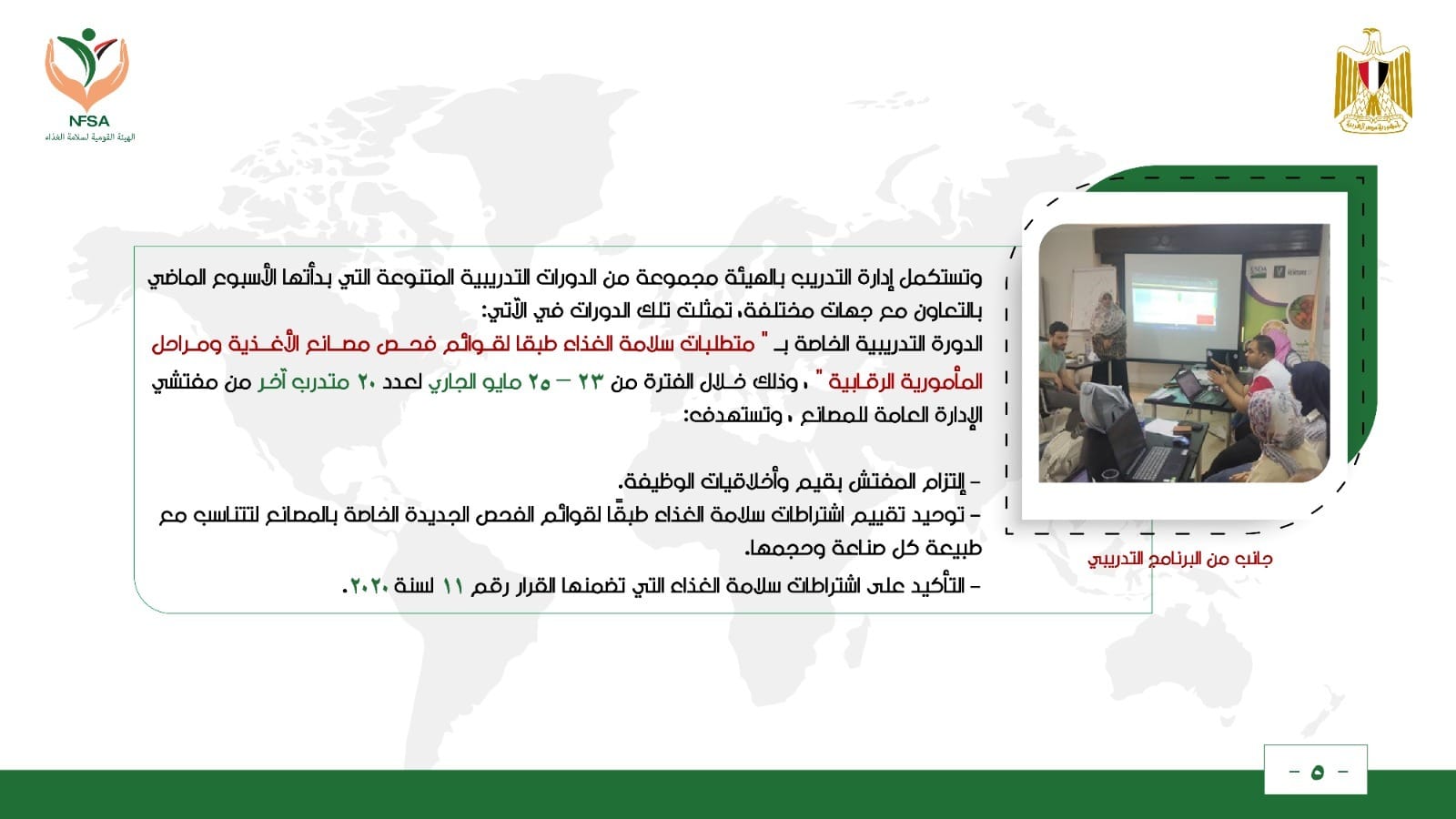 الدورة التدريبية الخاصة بــ ” متطلبات سلامة الغذاء طبقا لقوائم فحص مصانع الأغذية ومراحل المأمورية الرقابية ” ، وذلك خلال الفترة من 23 – 25 مايو الجاري لعدد 20 متدرب آخر من مفتشي الإدارة العامة للمصانع ، وتستهدف: