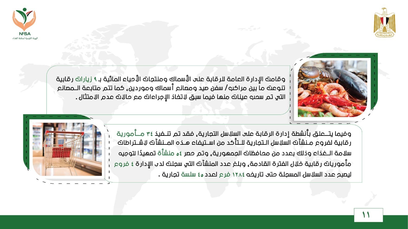 وقامت الإدارة العامة للرقابة على الأسماك ومنتجات الأحياء المائية بـ 9 زيارات رقابية، تنوعت ما بين مراكب/ سفن صيد ومصانع أسماك وموردين، كما تتم متابعة المصانع التي تم سحب عينات منها فيما سبق لاتخاذ الإجراءات مع حالات عدم الامتثال.