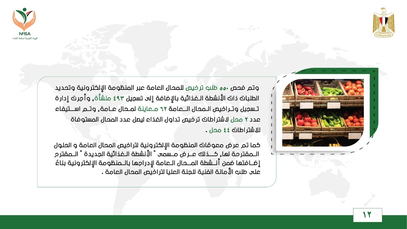وتم فحص 550 طلب ترخيص للمحال العامة عبر المنظومة الإلكترونية وتحديد الطلبات ذات الأنشطة الغذائية بالإضافة إلى تسجيل 493 منشأة، وأجرت إدارة تسجيل وتراخيص المحال العامة 62 معاينة لمحال عامة، وتم استيفاء عدد 2 محل لاشتراطات ترخيص تداول الغذاء ليصل عدد المحال المستوفاة للاشتراطات 44 محل.