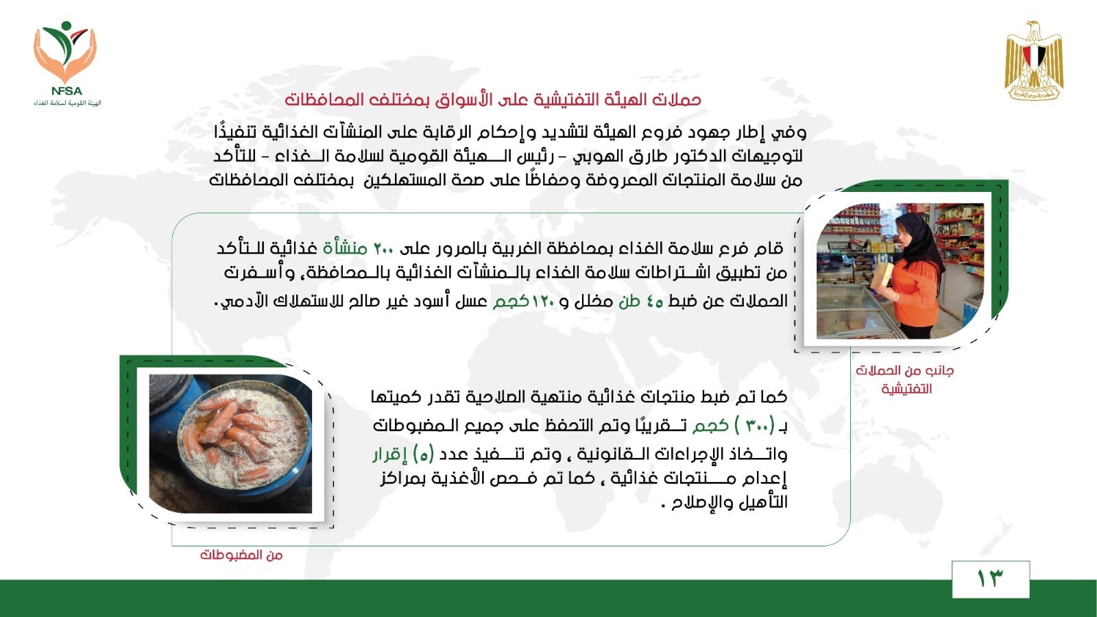 ضبط منتجات غذائية منتهية الصلاحية تقدر كميتها بـ (300 ) كجم تقريبًا ، وتم التحفظ على جميع المضبوطات واتخاذ الإجراءات القانونية ، وتم تنفيذ عدد (5) إقرار إعدام منتجات غذائية ، كما تم فحص الأغذية بمراكز التأهيل والإصلاح .