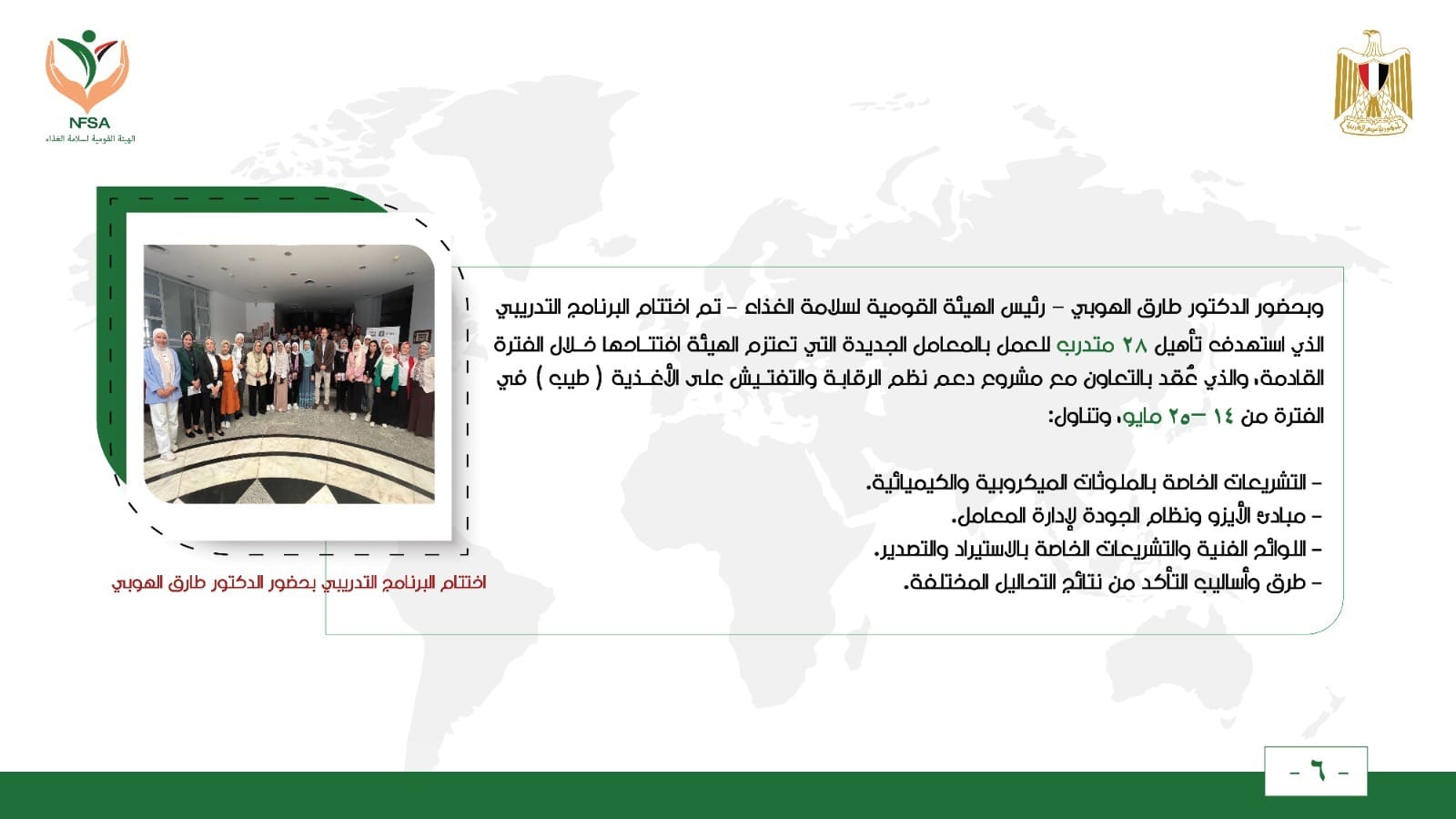 وبحضور الدكتور طارق الهوبي – رئيس الهيئة القومية لسلامة الغذاء – تم اختتام البرنامج التدريبي الذي استهدف تأهيل 28 متدرب للعمل بالمعامل الجديدة التي تعتزم الهيئة افتتاحها خلال الفترة القادمة، والذي عُقد بالتعاون مع مشروع دعم نظم الرقابة والتفتيش على الأغذية ( طيب ) في الفترة من 14 –25 مايو، وتناول: