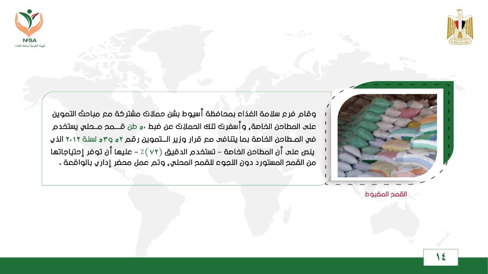 وقام فرع سلامة الغذاء بمحافظة أسيوط بشن حملات مشتركة مع مباحث التموين على المطاحن الخاصة، وأسفرت تلك الحملات عن ضبط 50 طن قمح محلي يستخدم في المطاحن الخاصة بما يتنافى مع قرار وزير التموين رقم 52 و53 لسنة 2012 الذي ينص على أن المطاحن الخاصة – تستخدم الدقيق (72)% – عليها أن توفر إحتياجاتها من القمح المستورد دون اللجوء للقمح المحلي، وتم عمل محضر إداري بالواقعة.