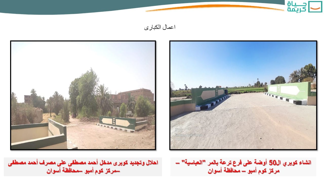 وأشار اللواء محمود نصار، إلى أن مشروعات “حياة كريمة” بمحافظة أسوان، تشمل أيضاً، إنشاء وتطوير 32 نقطة إسعاف، لتحسين خدمات الإسعاف المقدمة للمواطنين، وتم الانتهاء من 23 نقطة منها، كما تم الانتهاء من 70 كوبرى على المجارى المائية (إنشاء – إحلال وتجديد – تطوير وتوسيع)، من إجمالى 74 كوبرى، بالتنسيق مع المختصين من وزارة الرى بما يحقق تنفيذ الأعمال المطلوبة، وعدم تأثر المجارى المائية بهذه الأعمال، وتحقق الكبارى الربط المطلوب بين أجزاء القرية الواحدة وبين القرى وبعضها، بجانب الانتهاء من تنفيذ 4 مشروعات من إجمالى 19 مشروعاً لإنشاء ورفع كفاءة (وحدات اجتماعية – مراكز لتنمية الأسرة – مركز تأهيل اجتماعى)، ضمن مشروعات التضامن الإجتماعى.