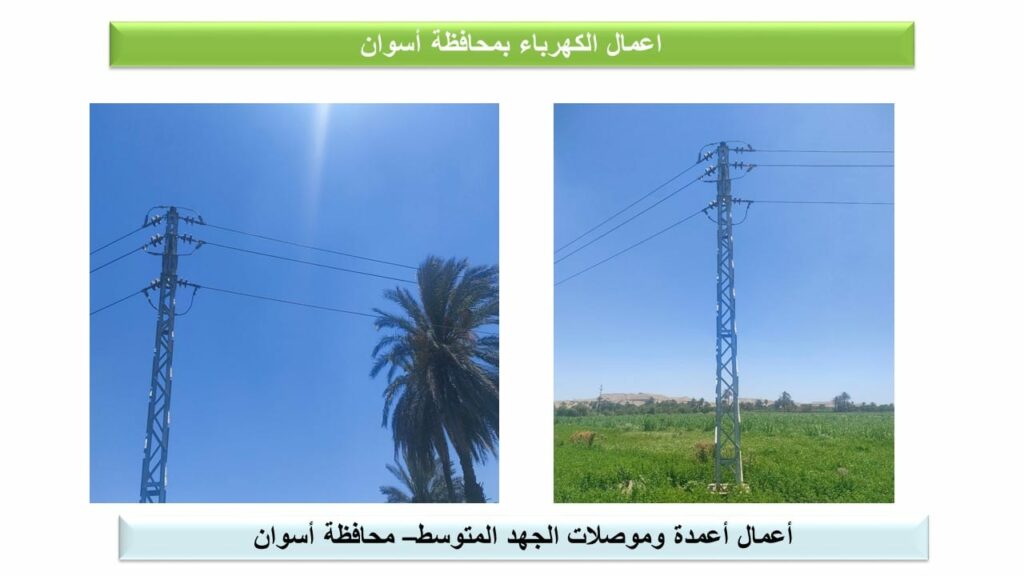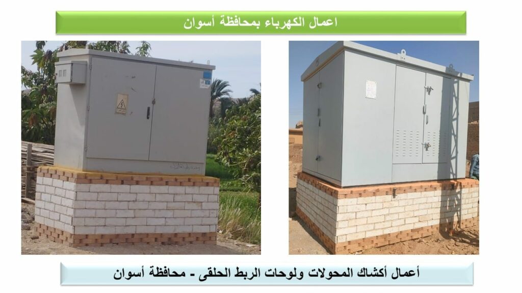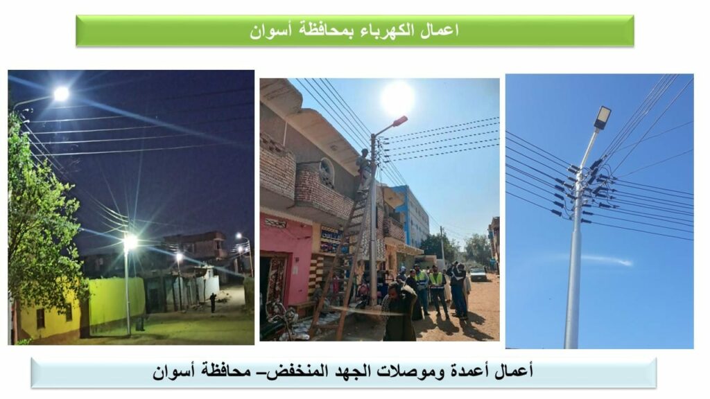 وقال اللواء محمود نصار، رئيس الجهاز المركزى للتعمير: تضم المشروعات المخططة والجارى تنفيذها حاليا بمحافظة أسوان ضمن المبادرة الرئاسية “حياة كريمة”، أعمال تطوير وتدعيم شبكات الكهرباء والإنارة العامة بـ98 قرية، لتحسين الخدمات المُقدمة للمواطنين، حيث تم إنهاء الأعمال وإطلاق التيار فى 30 قرية (14 قرية بمركز إدفو – 6 قرى بمركز كوم أمبو – 10 قرى بمركز نصر النوبة)، وجارٍ تنفيذ الأعمال بـ68 قرية، تتراوح نسب الإنجاز بها بين 50 و95 %، موضحاً أنه تم التنسيق مع وزارة الكهرباء والطاقة المتجددة لتحديد أعمال الكهرباء المطلوبة بالقرى، وتشمل، تأهيل شبكات الجهد المتوسط القائمة بإحلال المتهالك منها، وتغيير المحولات الهوائية إلى محولات داخل أكشاك صاج أو غرف، ورفع قدرات المحولات لتتناسب مع الأحمال الفعلية، وتغيير كابلات الجهد المتوسط والمنخفض لتتناسب مع الأحمال الفعلية، وتأهيل شبكات الجهد المنخفض القائمة بإحلال المتهالك منها، ورفع كفاءة شبكة الخطوط الهوائية وتغيير ما يلزم، إضافة إلى أعمال الإنارة العامة.